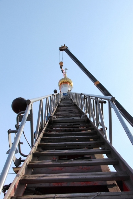 Установка куполов с крестами на строящийся храм в честь иконы Божией Матери "Споручница грешных" в Переяславке. 20 марта 2014 г.