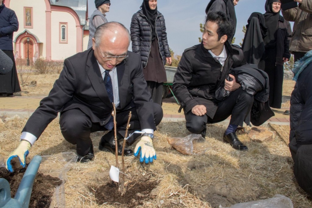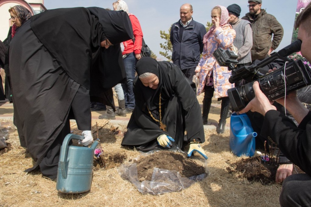 Высадка древовидных пионов на территории женского монастыря. 13 апреля 2019 г.